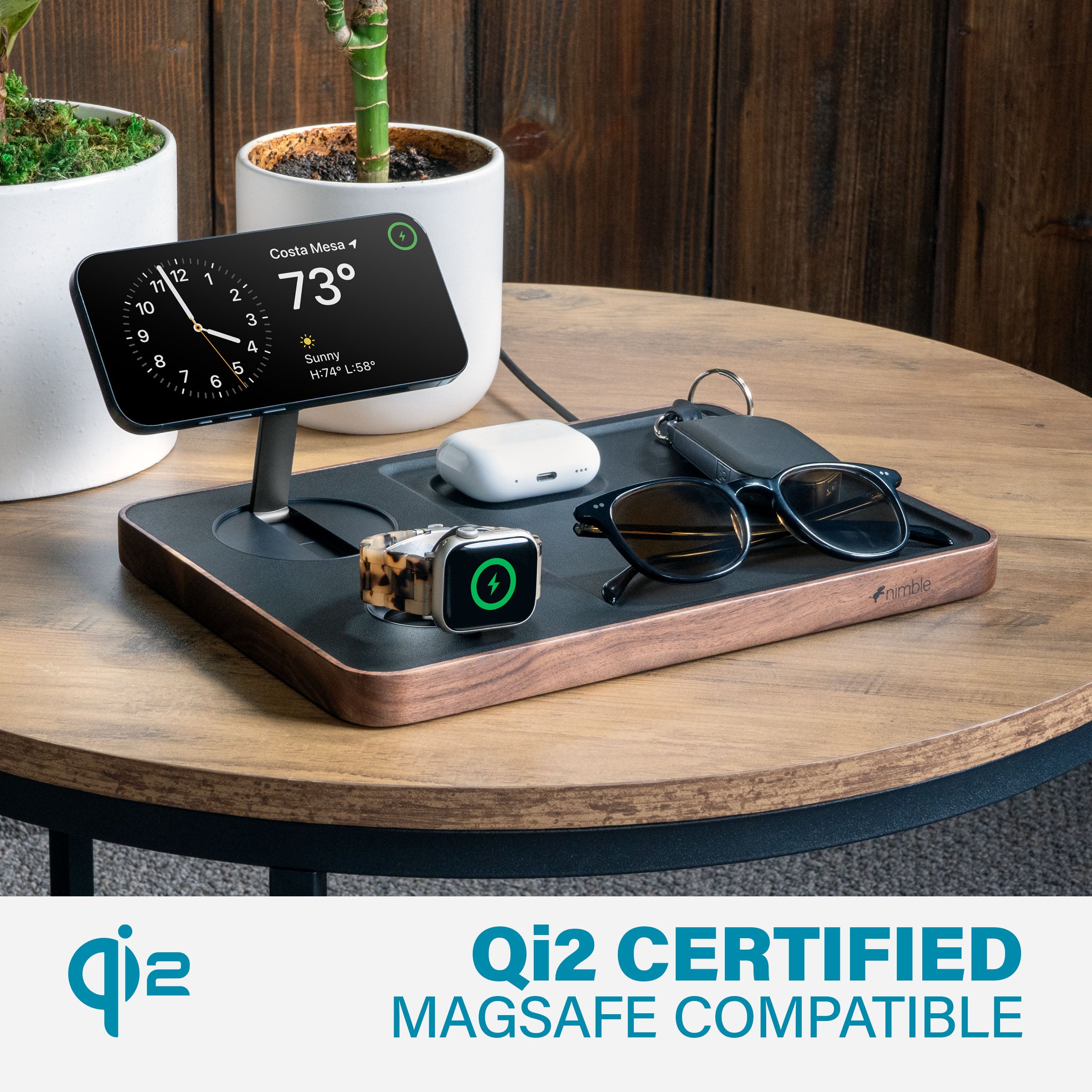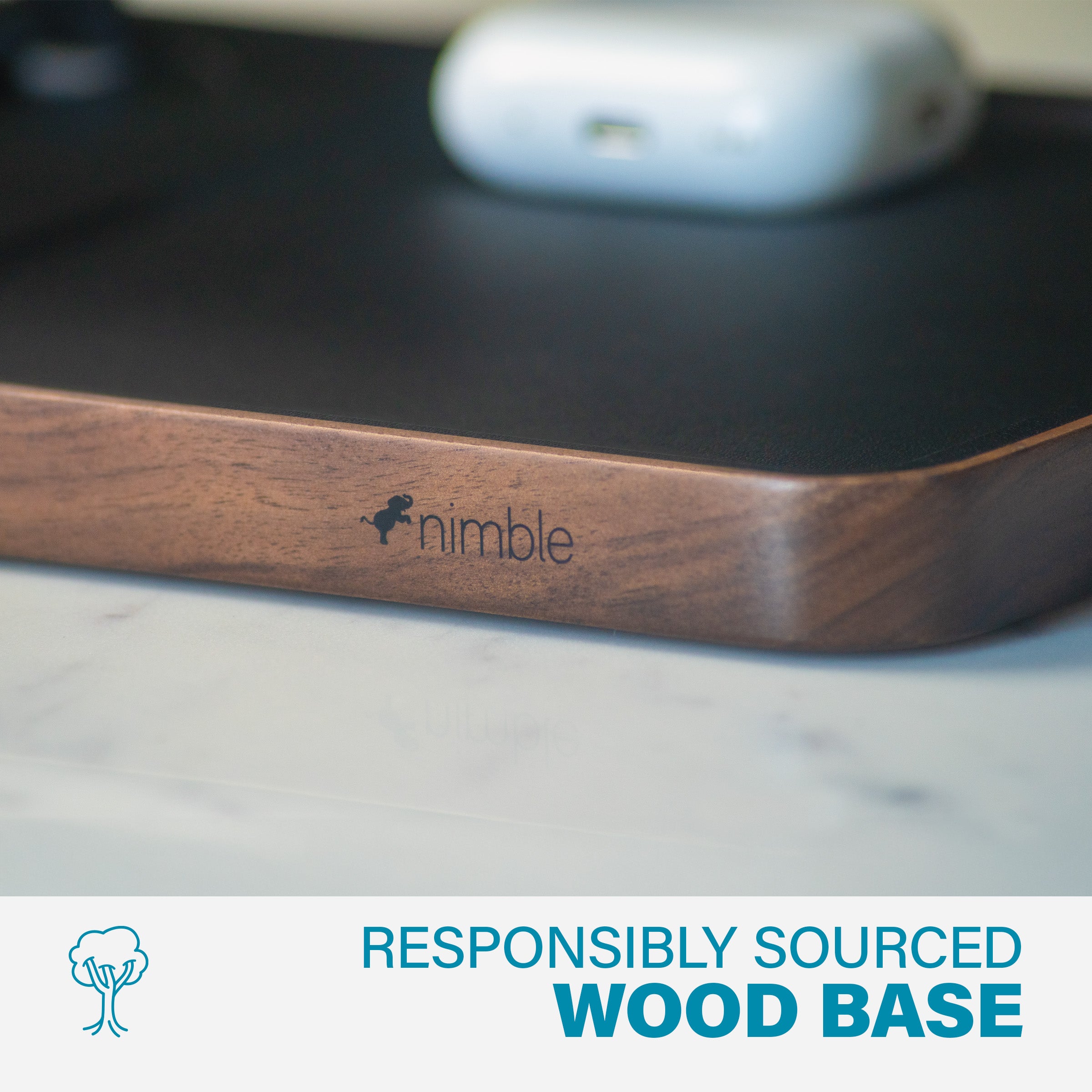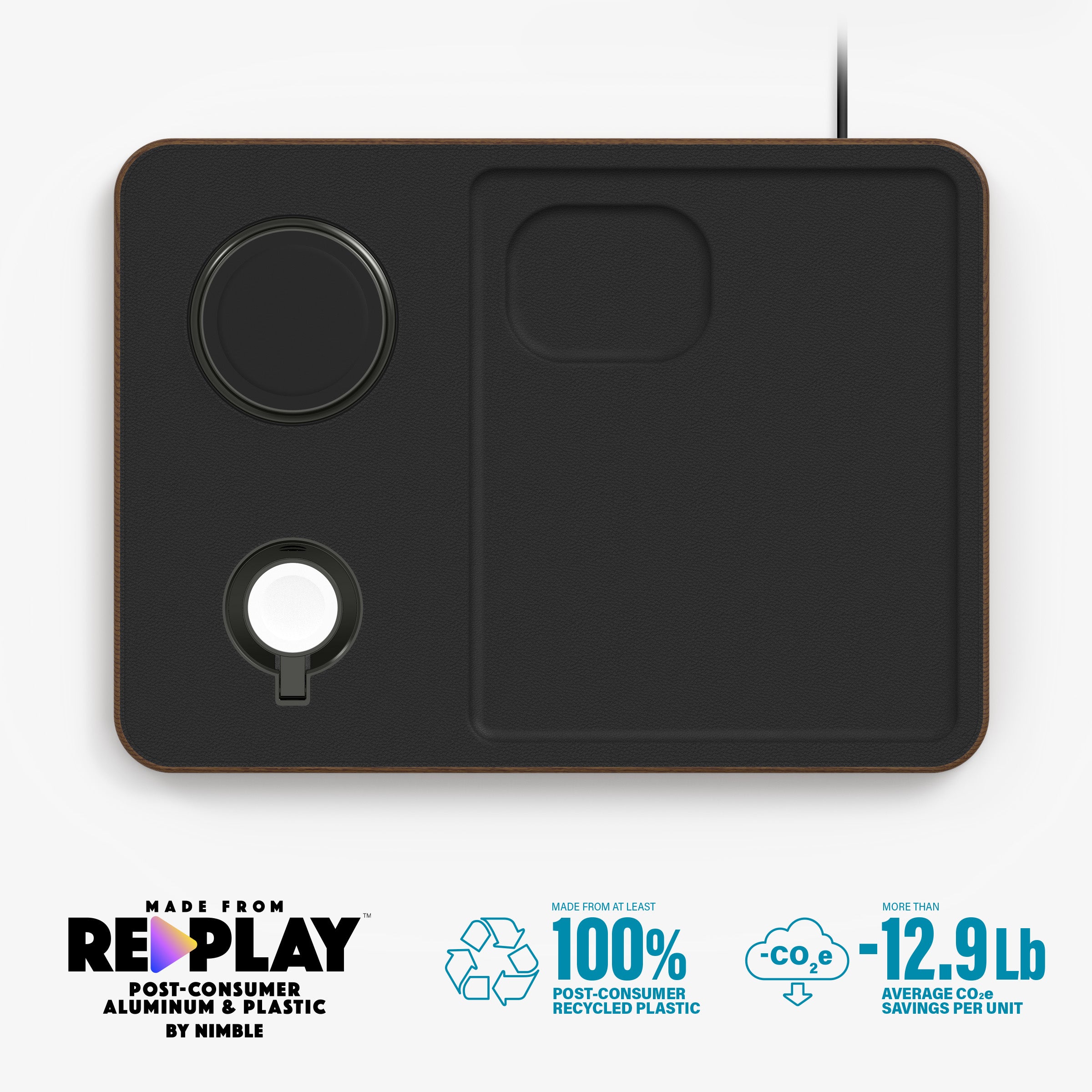 Crafted in aloe leather and dark walnut wood. Offers convenient placement for each device, and a spacious tray to keep track of your everyday essentials.