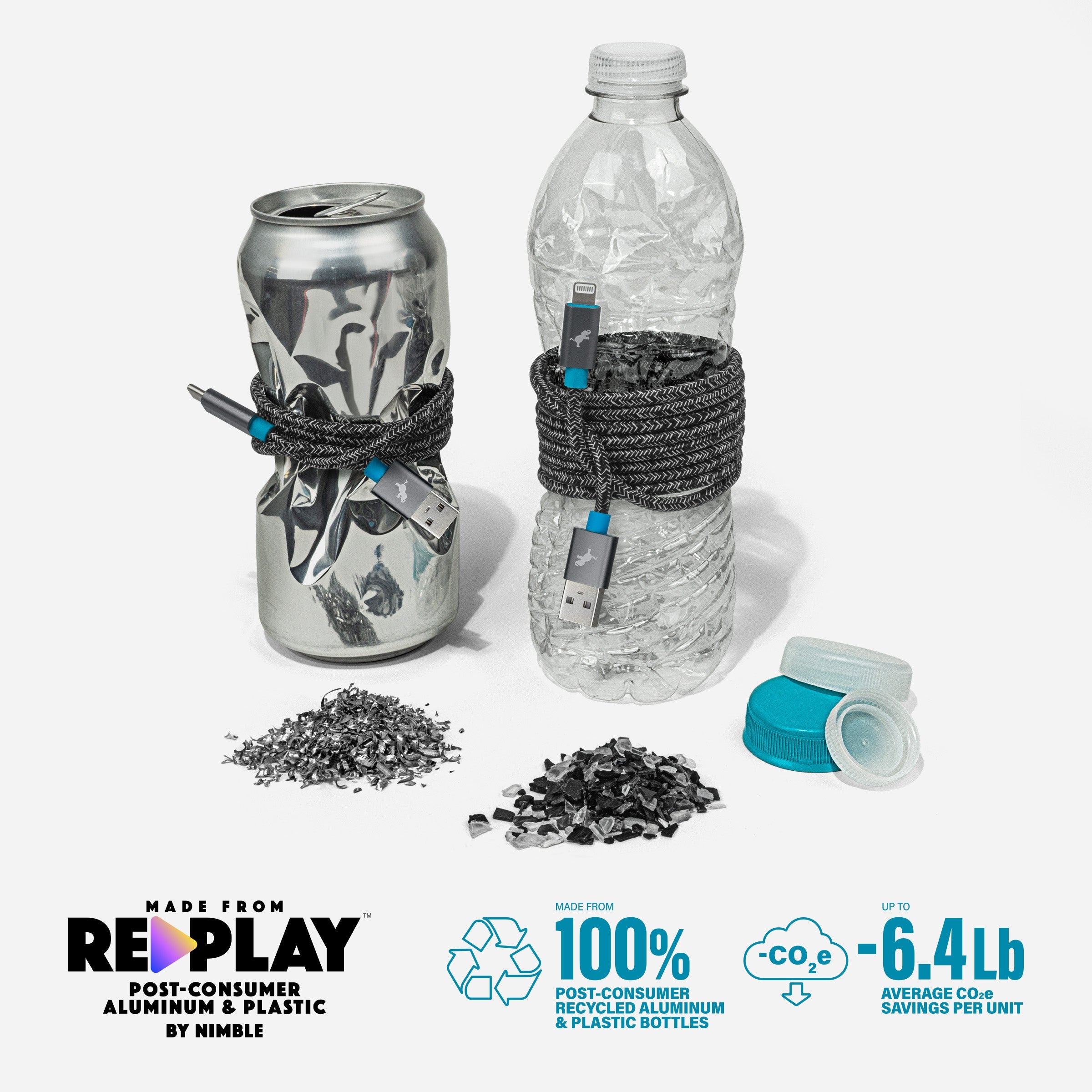 Made using a durable knit fabric derived from 100% recycled plastic bottles, and recycled aluminum cable heads to further reduce total footprint by -6.4 lbs of CO2 compared to other available cables.