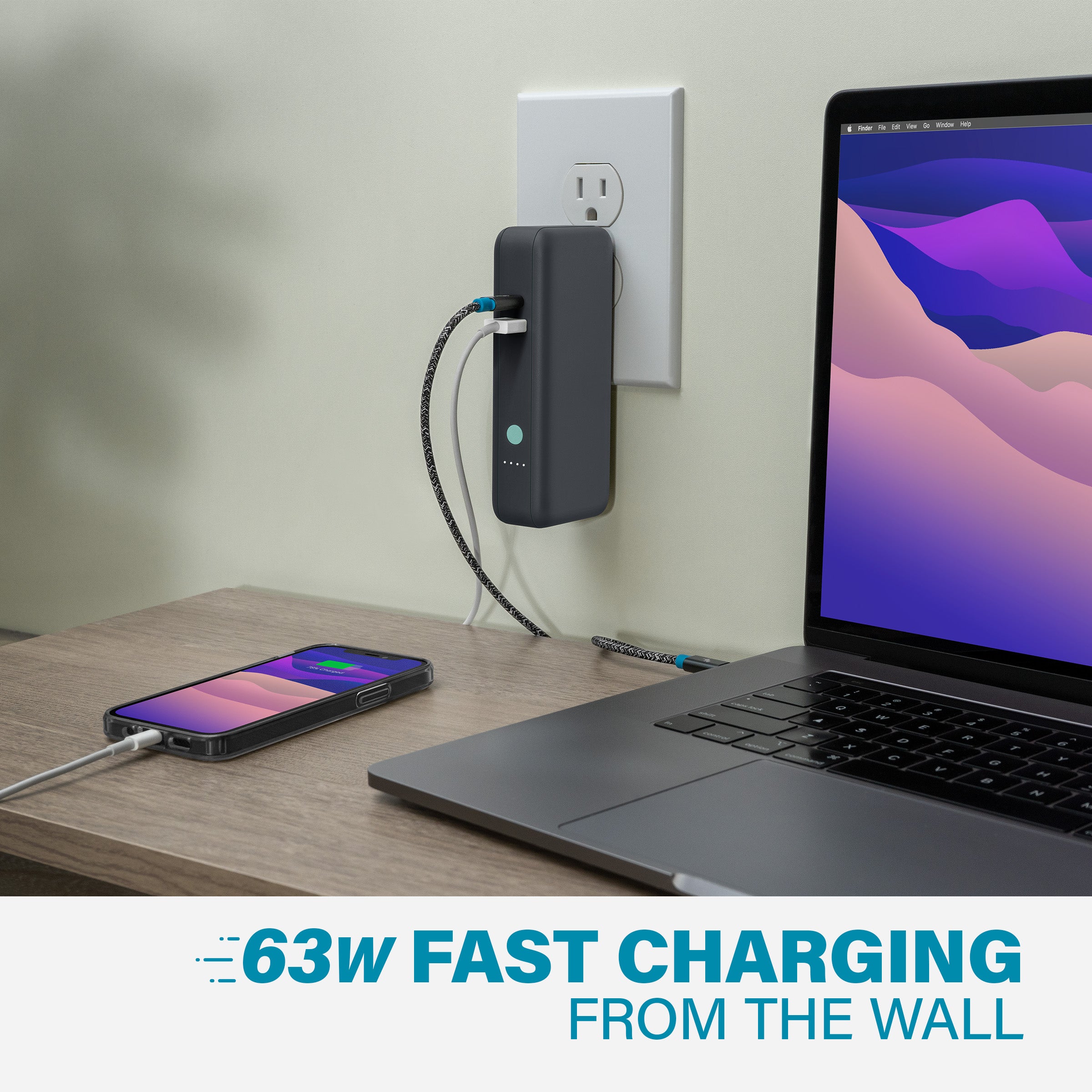 Plug it in. Charge a Macbook or USB-C powered laptop at full 60W speed - or split the charge between both ports for 45W & 18W fast charging.