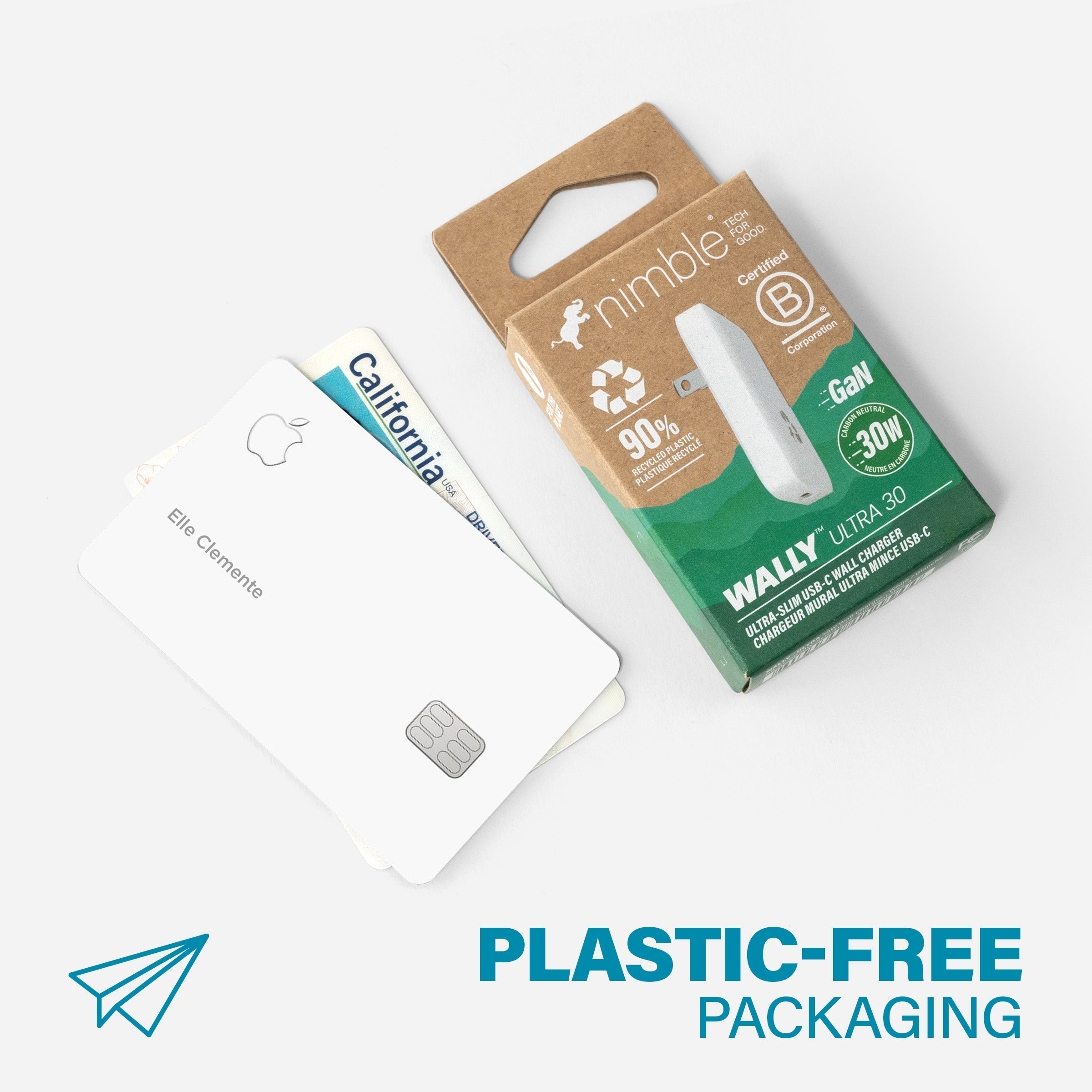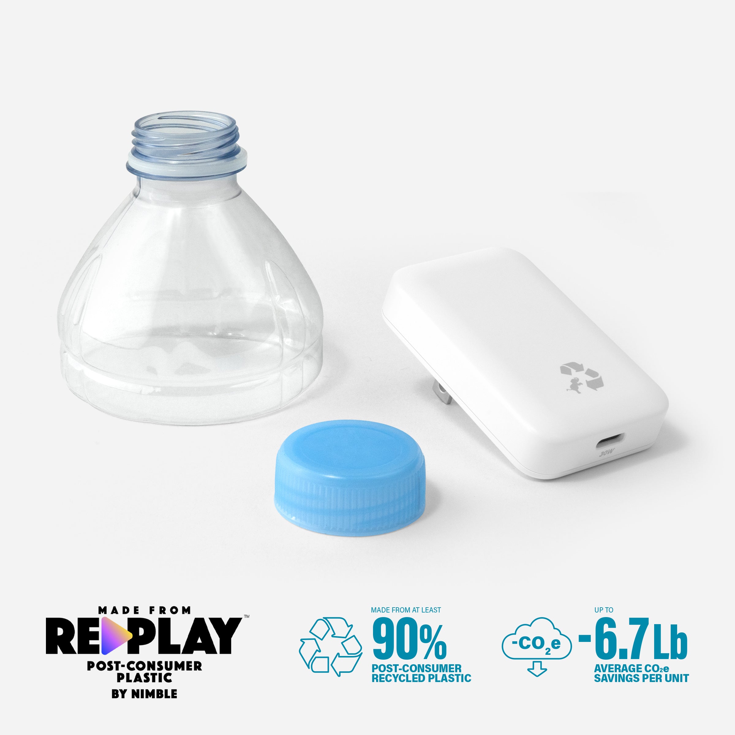 Housed in 90% post-consumer plastic, and packaged in post-consumer scrap paper for an average saving of -6.7 lbs of CO2 compared to other wall chargers. Plus, includes free e-waste recycling for your old tech!